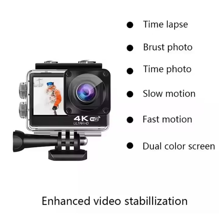 პროდუქტის ზომა - 118*32*25 მმ შიშველი მეტალი, სიგრძე*სიგანე*სიმაღლე აპარატურის სპეციფიკაციები: DSP V316 სენსორი - Sony IMX386 12M ლინზის ბრუნვა - 180 გრადუსი LCD 1.3 IPS LCD 320x240 ლინზა - 5G+IR,FNO2.4,FOV150 მეხსიერება - LPDDR3 2G ვიდეოს კოდირება - H. 264 ROM - SPI 128M WIFI - კი EIS - კი AV-OUT - კი USB USB2.0 მონაცემთა კომუნიკაცია გარე TF ბარათი TF ბარათი, მაქსიმუმ 128GB CLASS 6 ან მეტი დინამიკი - 8Ohm 0.8W ლითიუმის ელემენტის ტევადობა - ჩაშენებული 900mAh მიკროფონი - ჩაშენებული მიკროფონი 4 ღილაკი, ჩართვა/რეჟიმი, ჩაწერა/OK, ზევით, ქვევით ფუნქციური მახასიათებლები: ვიდეოს გარჩევადობა - 4K/60FPS/30PFS(3840x2106) 2.7K/30FPS(2688x1520) 1080P/120FPS/60FPS/30FPS(1920*1080) 720P/240FPS/120FPS/60FPS/30FPS(1280×720) კამერის გარჩევადობა - 8M,13M,16M,20M ვიდეოს ფორმატი - MP4